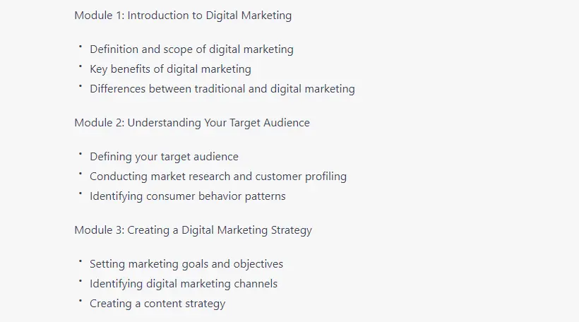 Below is an example of how I did it. I wrote a prompt asking for a structured course outline for an online course on the basics of digital marketing. And ChatGPT came up with the following results.