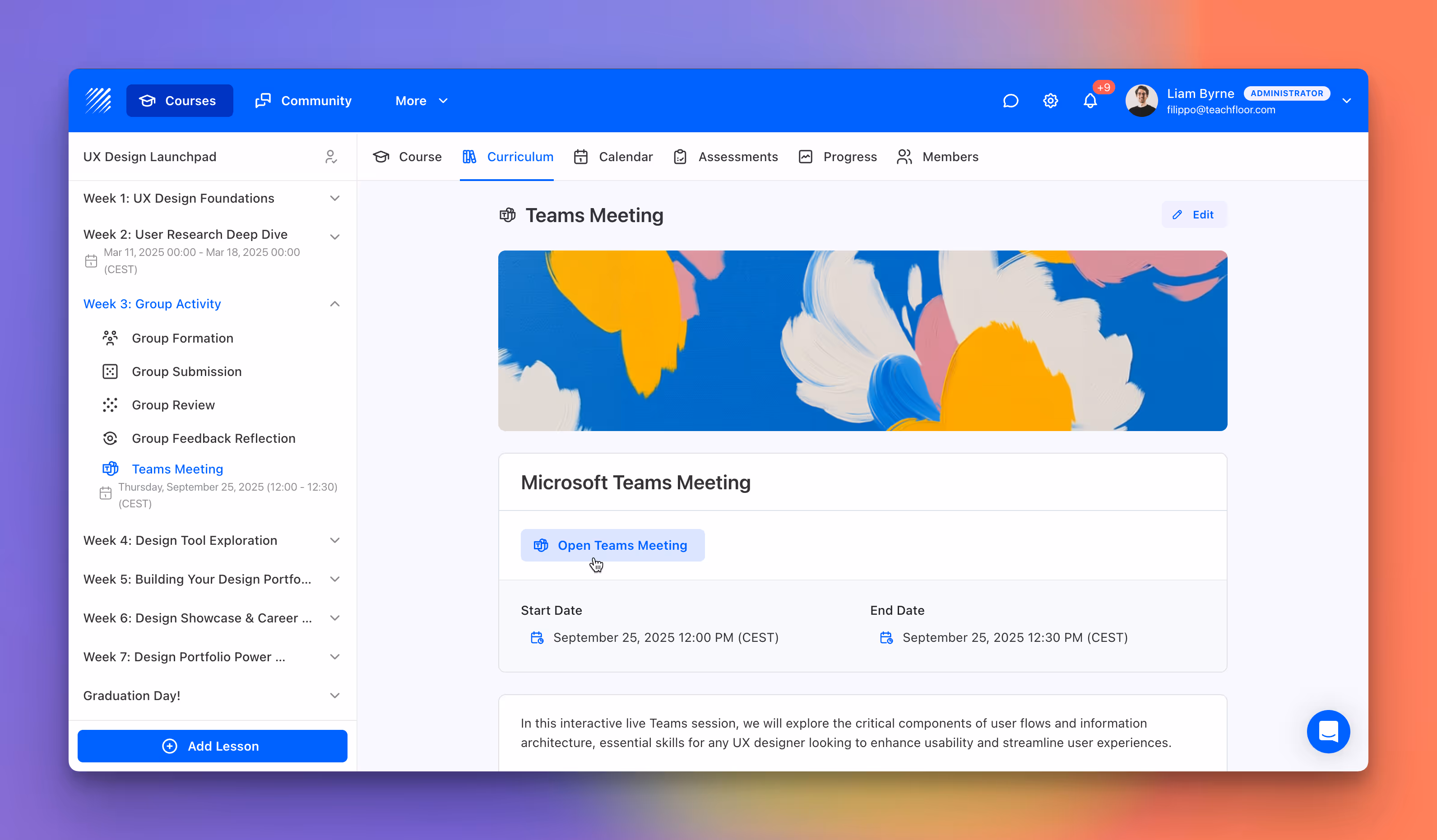 Teachfloor now connects with Microsoft Teams, letting you host live classes, manage schedules, and share meeting links directly in your course.