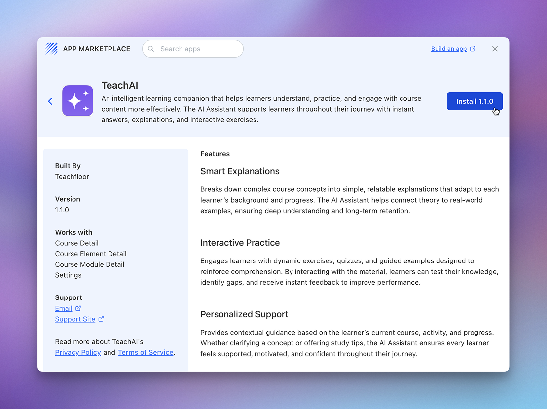 TeachAI is now available in the Teachfloor App Marketplace. Activate it today and bring personalized, AI-powered assistance directly into your courses.
